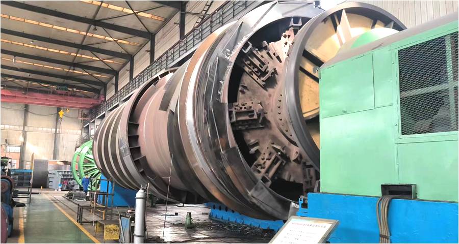 公司加工φ4.4×15m青灰爐爐體左段正在重型成套廠大頭車上進行精車工序。